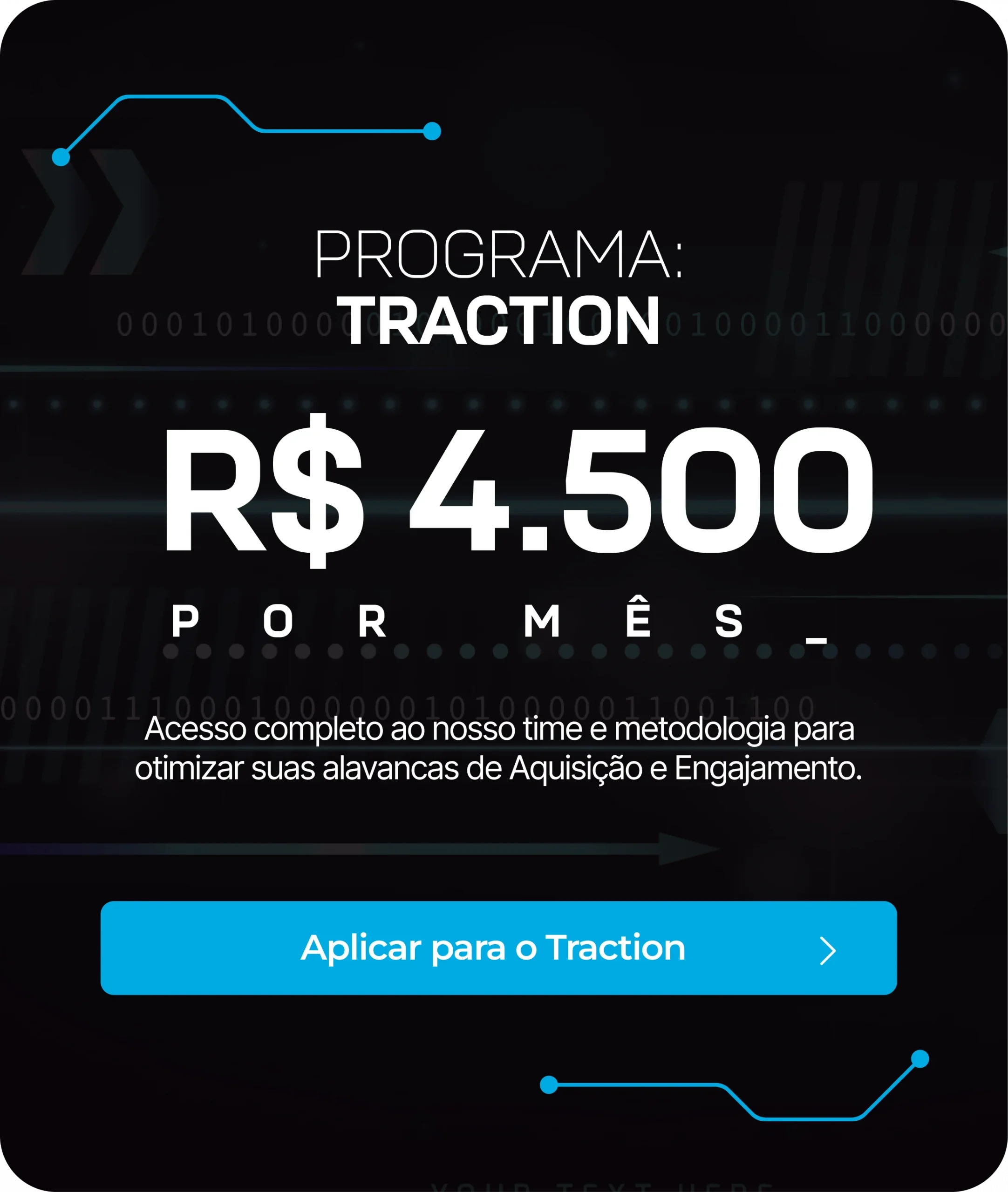 Para empresas que já validaram seus canais, mas sentem o crescimento travado. Nós destravamos sua Aquisição e Engajamento para transformar esforço em avanço real.